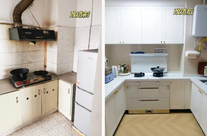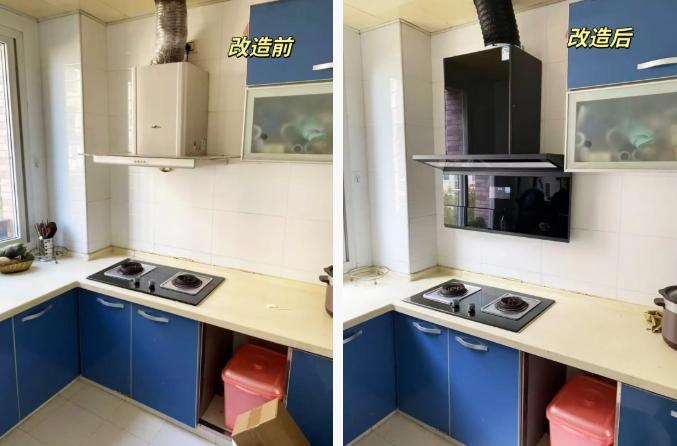 改造前舊煙機噪音大、吸力弱,經(jīng)常漏煙。顏值拉胯影響廚房美觀,用戶希望快速安裝,不影響日常使用。