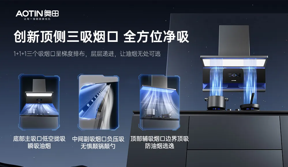 奧田頂側(cè)三吸油煙機(jī),讓爆炒無痕