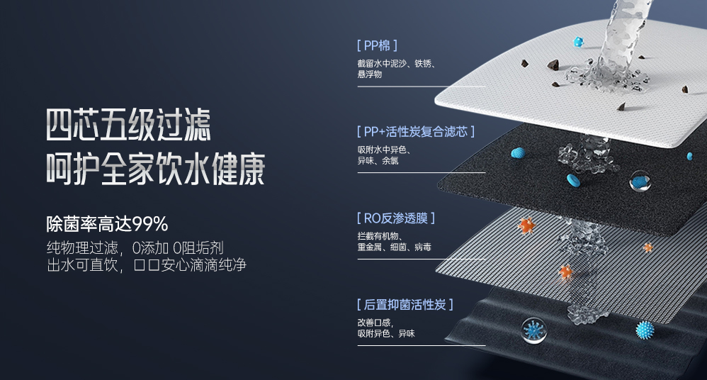 | 濾芯結構 | PPT致密過濾棉+棉炭復合濾芯+RO反滲透芯+T33后置活性炭濾芯 |